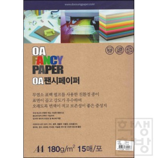 사무용 색지의 새로운 기준!! < OA 팬시페이퍼 > 일반 복사지(80g)보다 두꺼운 용지로 무염소 표백 펄프를 사용한 친환경 종이입니다. 표면이 곱고 강도가 우수하며 오래도록 변색이 적고 보존성이 좋은 중성지로, 잉크젯 / 레이져 프린트에 모두 사용이 가능하며 문서에 포인트가 되는 용지 또는 공예용 등으로 다양하게 활용할 수 있습니다. - 규격 : A4 (210 X 297 mm) - 평량 : 180g /㎡ - 매수 : 15매