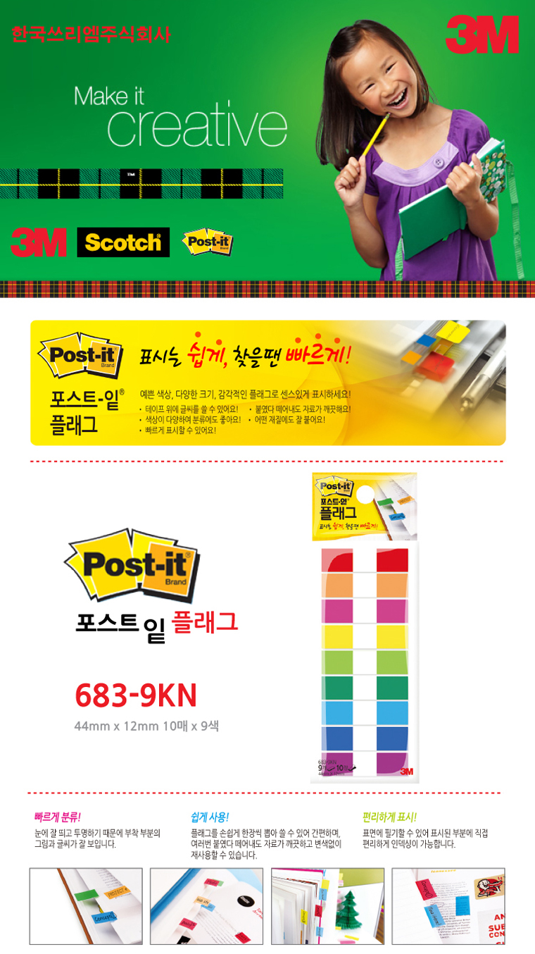 상품 정보상품 상세설명![]() * 포스트-잍 플래그 : 책갈피/ 서류 등의 중요한 페이지 뿐만 아니라 두꺼운 책에도 여러 가지 색상의 플래그를 붙일 수 있어 분류가 쉽습니다. 또한 새로운 디자인의 디스펜서 형태로 휴대와 보관까지 쉽습니다. * 눈에 잘 띄고 투명하기 때문에 부착 부분의 그림과 글씨가 보이고 붙였다 떼어내도 자료가 깨끗합니다. * 어떤 재질에도 잘 붙으며/ 글로 쓸 수 있어 편리합니다. * 크기 : 12×44cm(20장×9색) 사용후기등록된 사용후기사용후기가 없습니다. 상품문의등록된 상품문의상품문의가 없습니다. 배송정보오후 2시 이전 주문완료건(제작건 제외)에 대해서는 당일발송을 원칙으로 합니다. 단,재고부족 상품은 입고후 출고되며 최대 4~5일 더 소요됩니다.