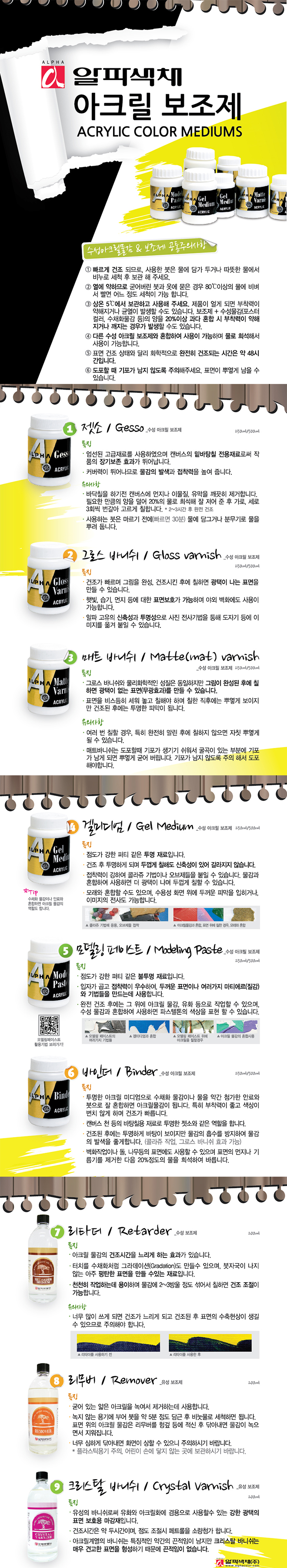 상품 정보상품 상세설명![]() *겔 메듐은 액체 상태로 되어있지 않고 크림 같은 형태로 점도가 강하고 아주강한 접착력을 가지고 있습니다.회구에 혼합하면 그 강한 점도에 의하여 유화같이 두텁게 그리는 기법처럼 텃치를 낼 때에 사용합니다. 아크릭칼라와는 2대1 비율로 혼합하여 사용하며 분말 회구의 바인다로써 접착력을 이용할 수 있습니다. 사용후기등록된 사용후기사용후기가 없습니다. 상품문의등록된 상품문의상품문의가 없습니다. 배송정보오후 2시 이전 주문완료건(제작건 제외)에 대해서는 당일발송을 원칙으로 합니다. 단,재고부족 상품은 입고후 출고되며 최대 4~5일 더 소요됩니다.